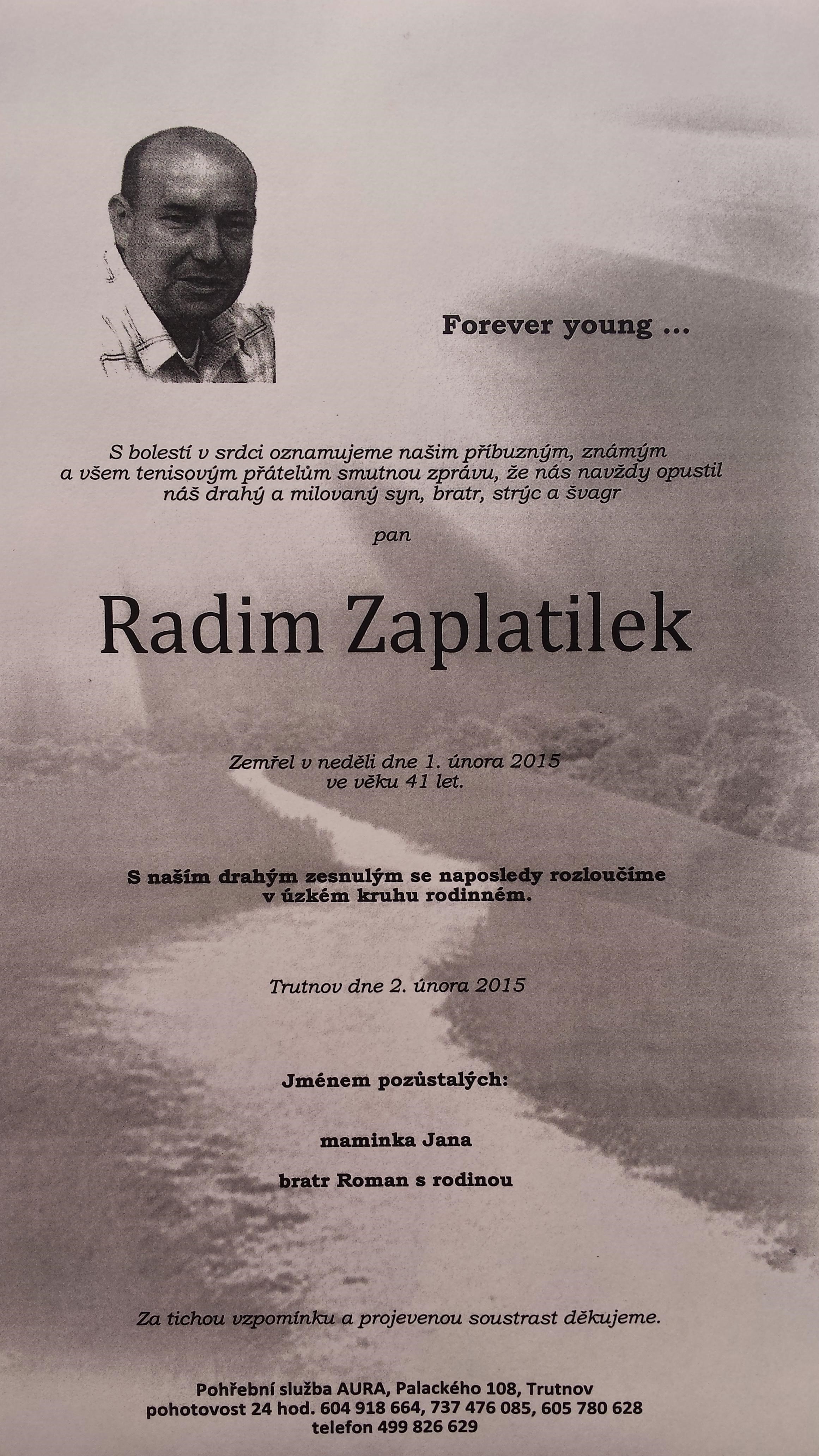 KlubySmuteční oznámení Únor 4, 2015 S hlubokým zármutkem oznamujeme všem východočeským tenistům smutnou zprávu, že dne 1.2. 2015 nás navždy opustil prezident VčOTS Radim Zaplatilek.
